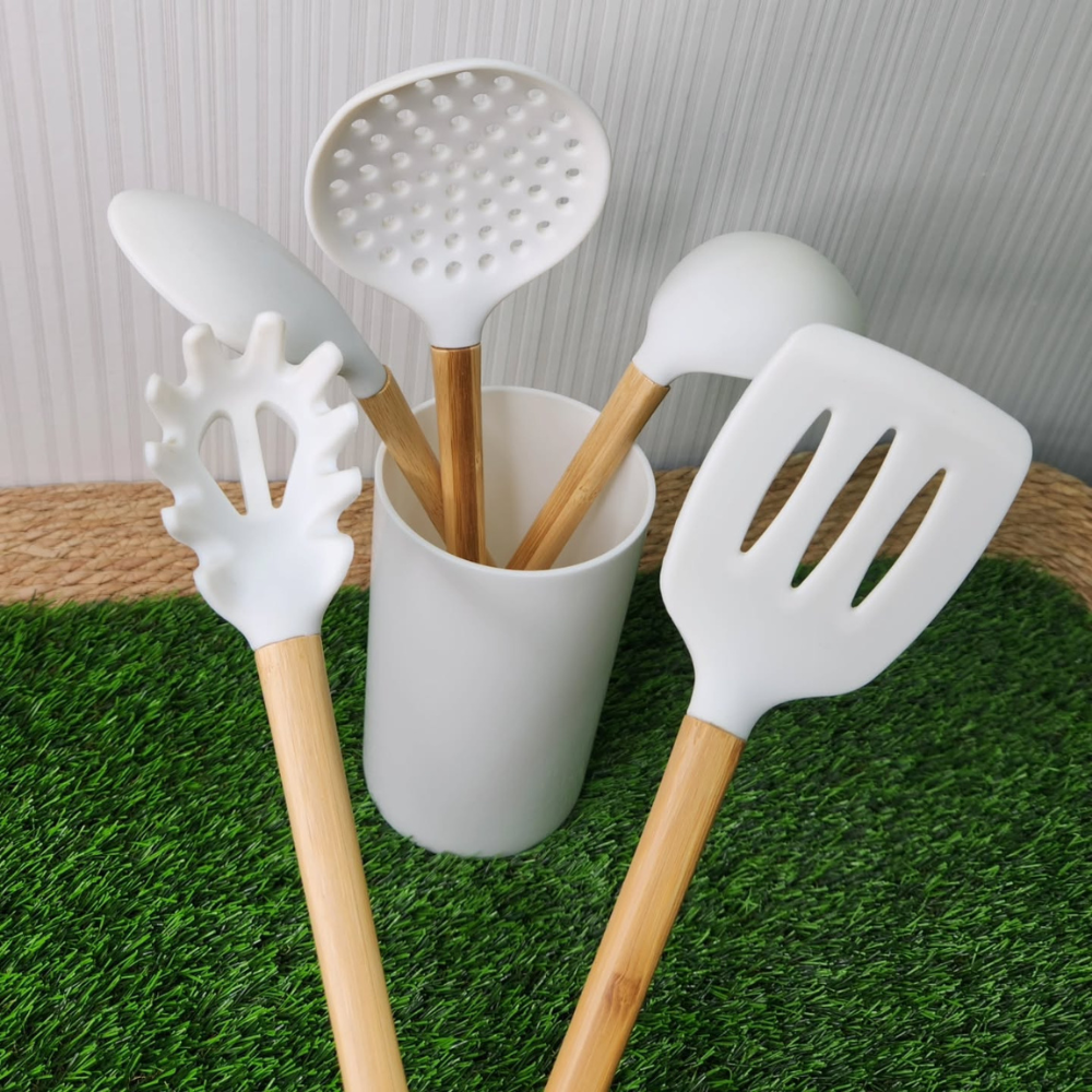 Ten zestaw przyborów kuchennych zawiera niezbędne narzędzia wykonane z trwałych bambusowych rączek i odpornych na wysoką temperaturę silikonowych końcówek. Nowoczesny biały design doskonale komponuje się z każdym stylem kuchni. Lekkie, a jednocześnie solidne, idealnie nadają się do codziennego gotowania. Łatwe w czyszczeniu i delikatne dla naczyń nieprzywierających, łączą funkcjonalność z elegancją. Niezbędny zestaw dla początkujących i doświadczonych kucharzy.